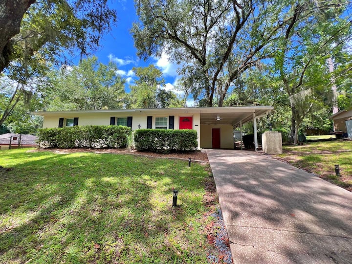 Pet-friendly retreat with crackling fireplace, private screened pool, and fully equipped kitchen. Just 10 min from FSU.